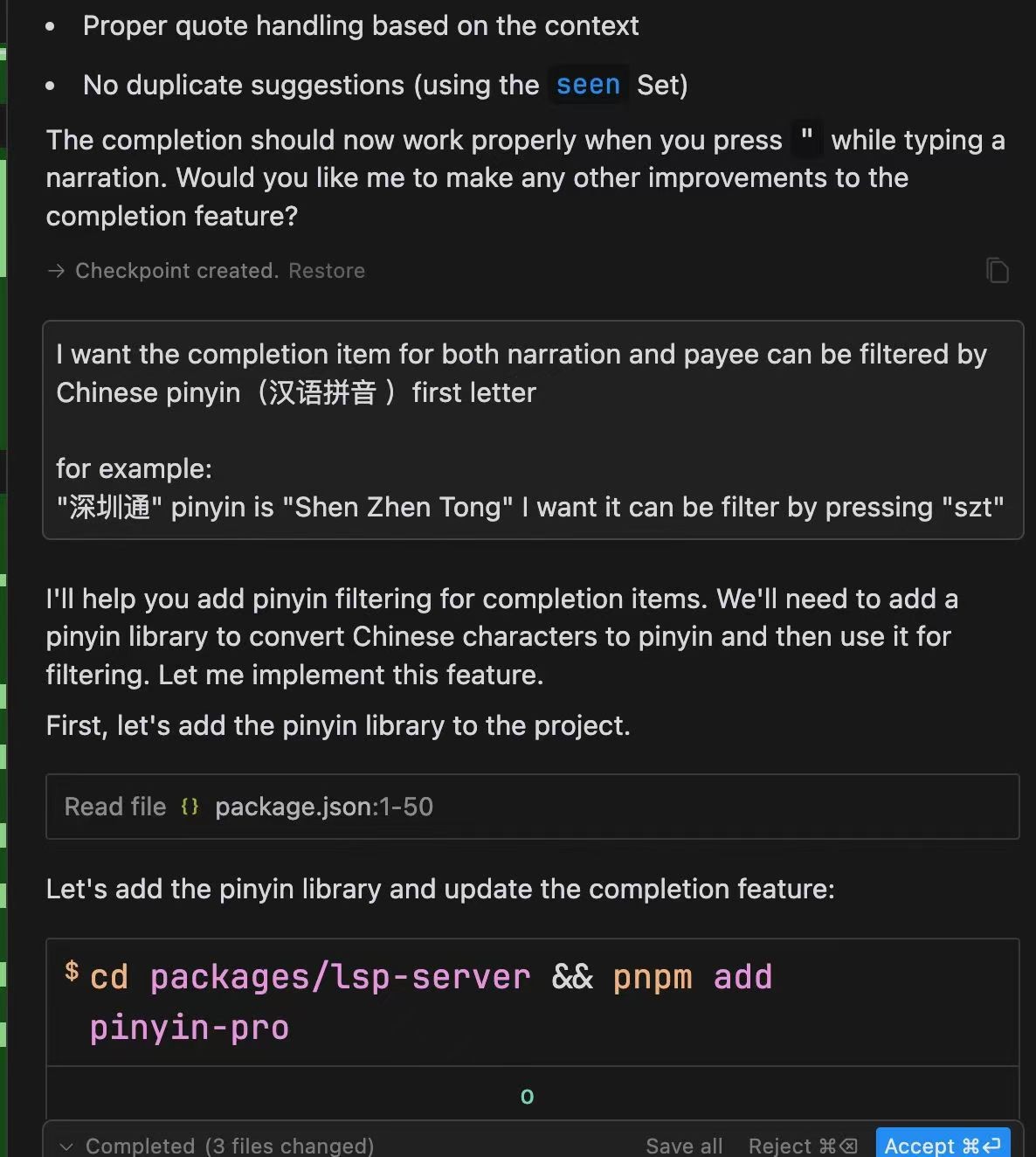 两年前开坑的时候是想让它跑在浏览器里,让我在用 github.dev 记账时能有个高亮和补全。结果工作繁忙(加上怠惰)一直没怎么搞就这么放了很久,直到最近重新上手 Cursor。虽然还没在VSCode for Web里跑里来,但在 Curosr 的帮助下实现了一直以来想要做的几个功能,发了一个版本。
