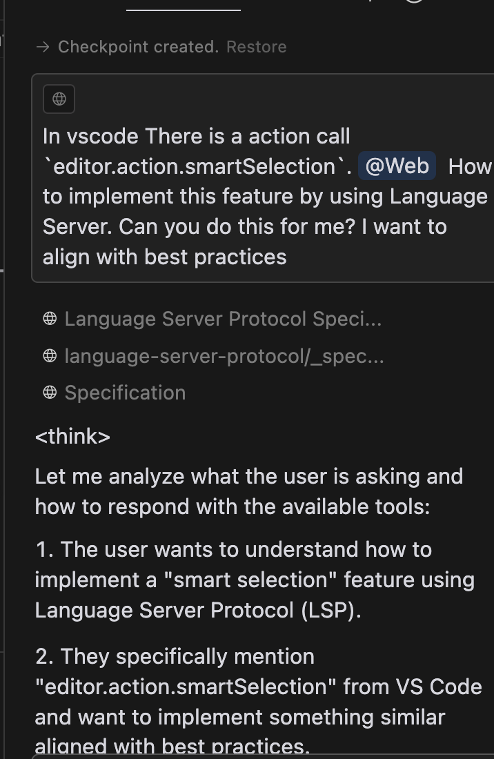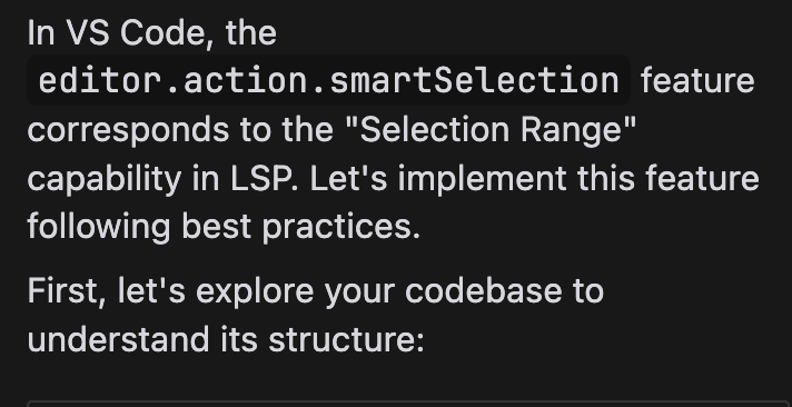 还有一些时候是 AI 特别好使的,比如我知道VSCode有一个功能是 smart selection(类似 JetBrains 玩家的 Ctrl+W),但我不知道是 Language Server Protocol 里哪个东西的时候,换以前我要找半天,现在 AI 直接告诉我答案